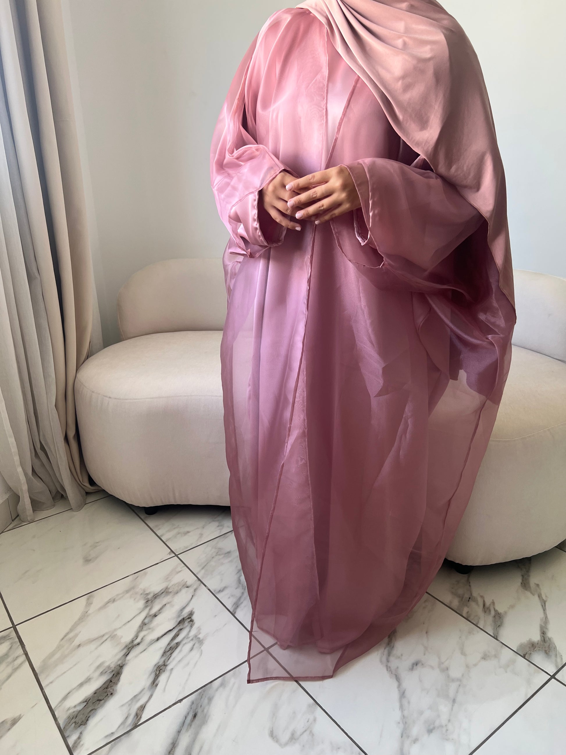 Abaya coupe farasha, pensée pour se porter seule ou glissée sous le kimono en organza, se distingue par son tombé et son éclat.