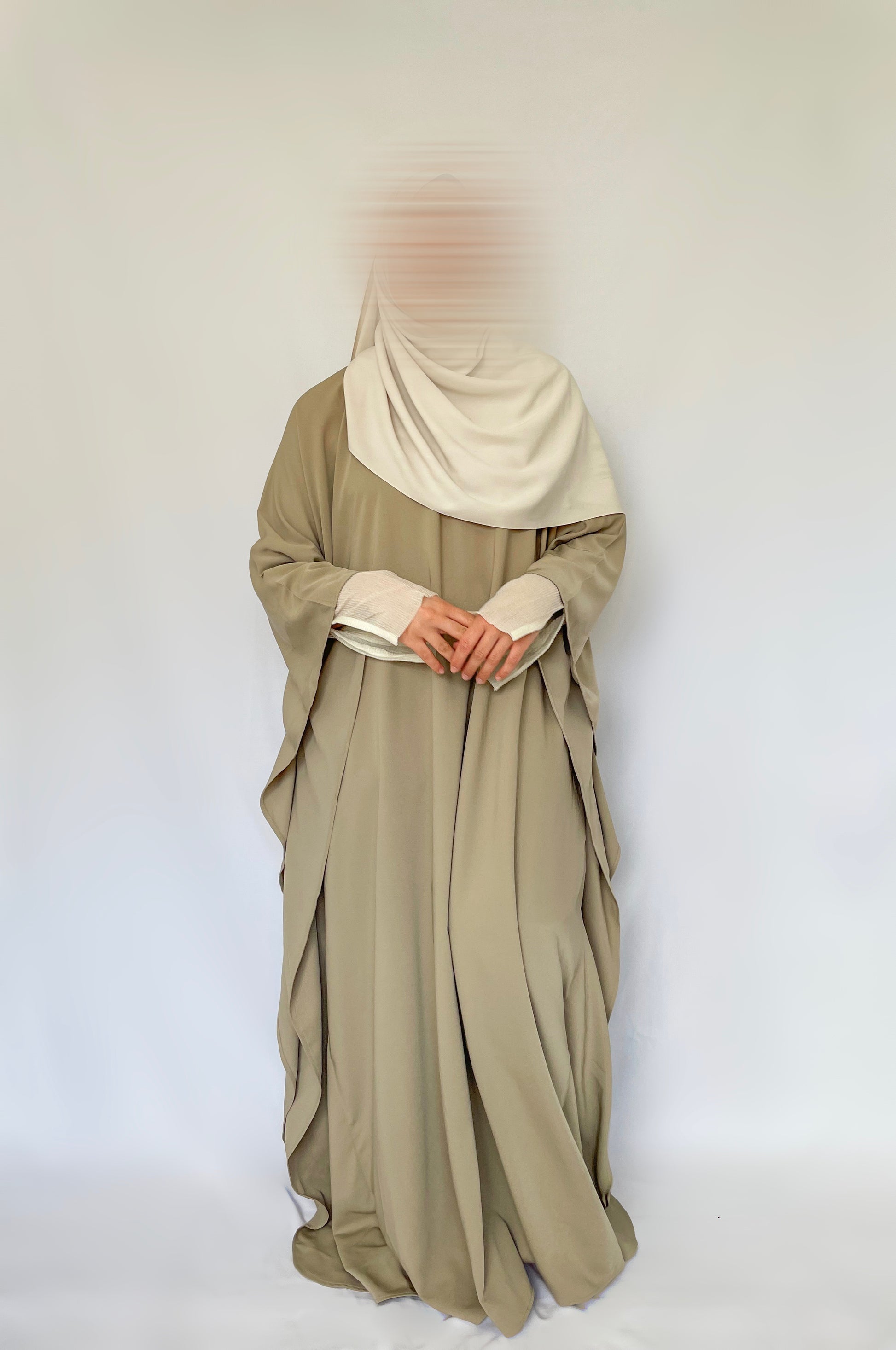 Cette abaya coupe papillon offre un tombé fluide grâce à son crêpe léger, sublimé par des manches en tulle plissé pour une touche de délicatesse.