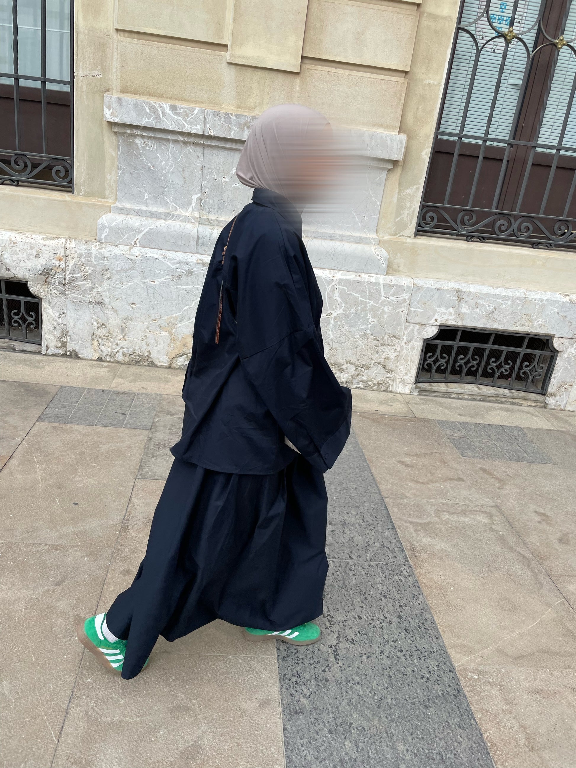 Ensemble oversize composé d'une chemise ample et d'une jupe longue en popeline doublée, alliant minimalisme et confort tout en assurant une opacité parfaite.