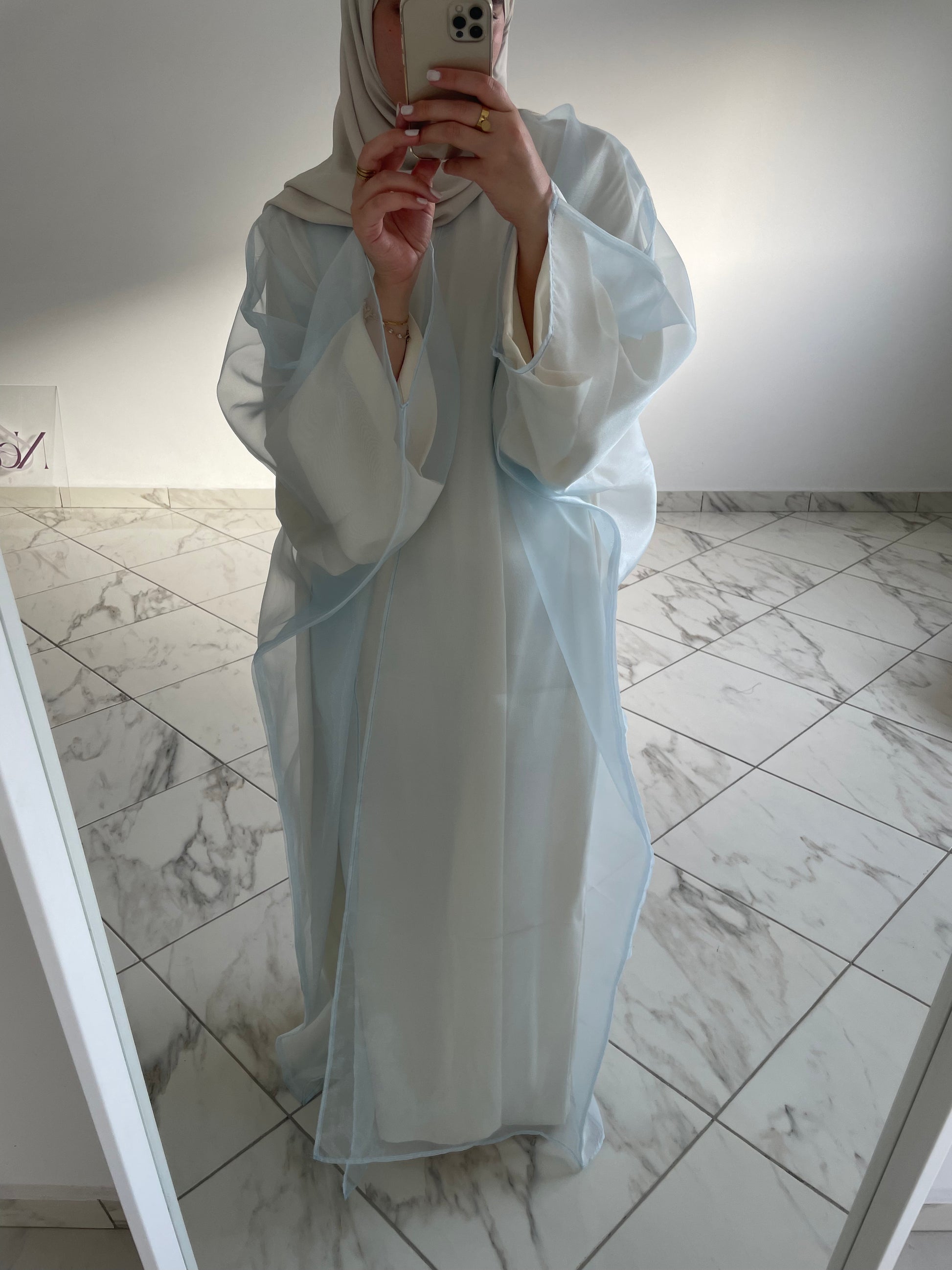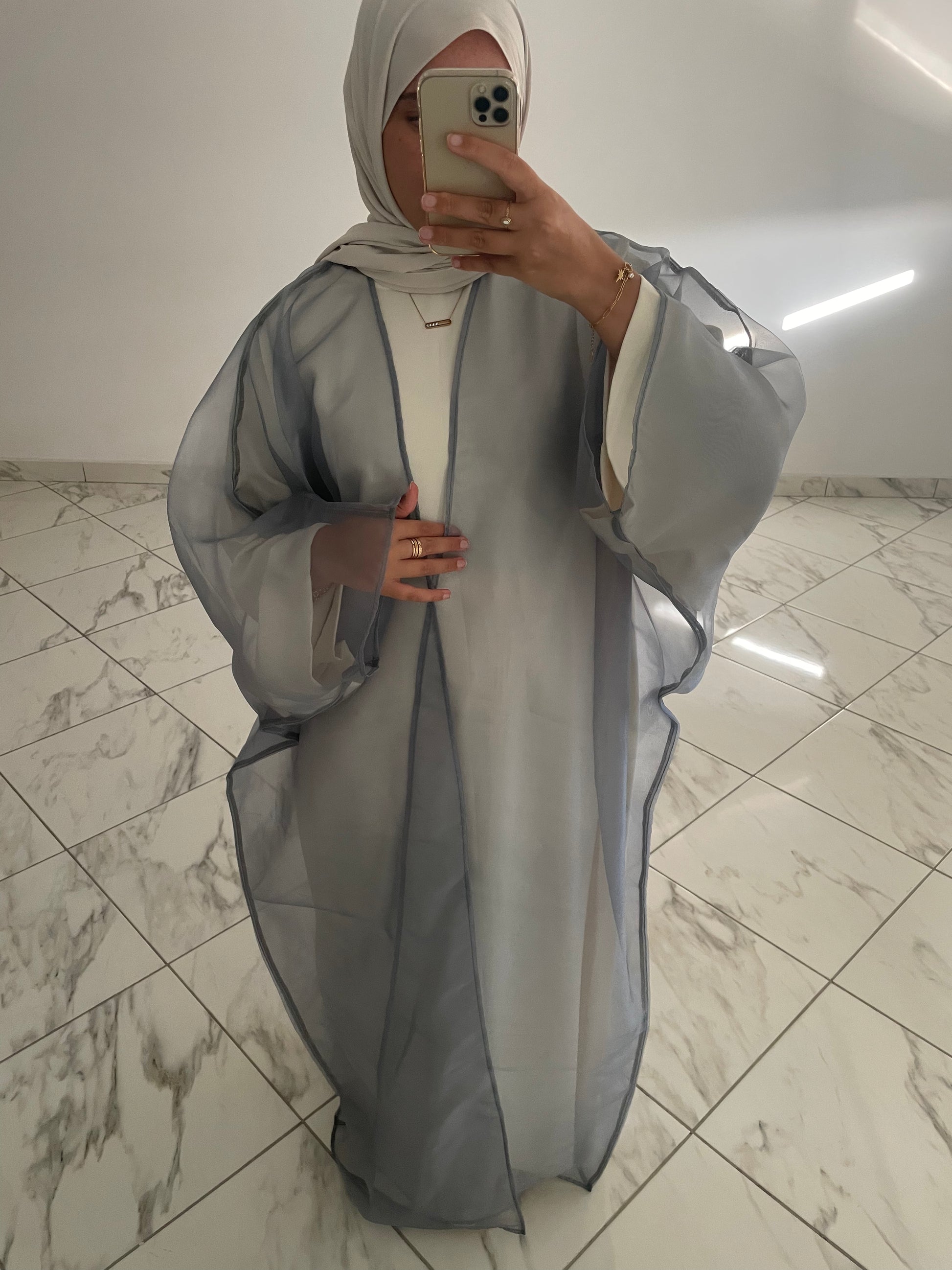 Le kimono coupe farasha, confectionné en organza transparent, flotte autour du corps et capte la lumière à chaque mouvement.