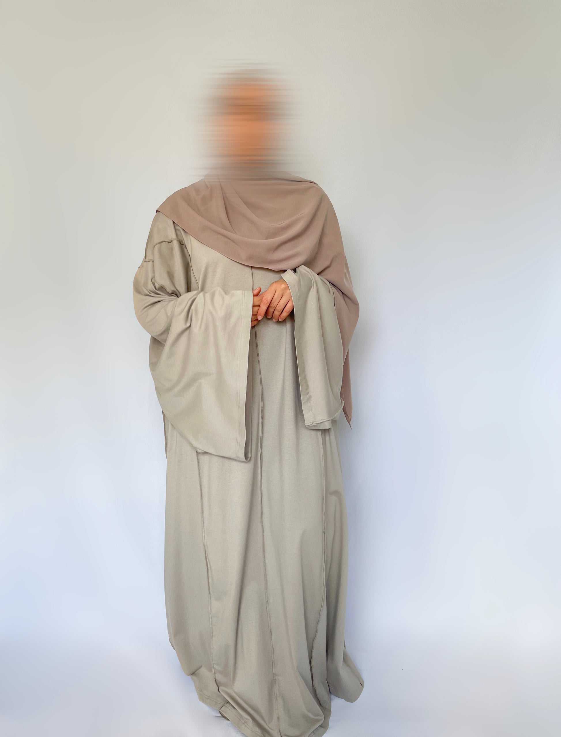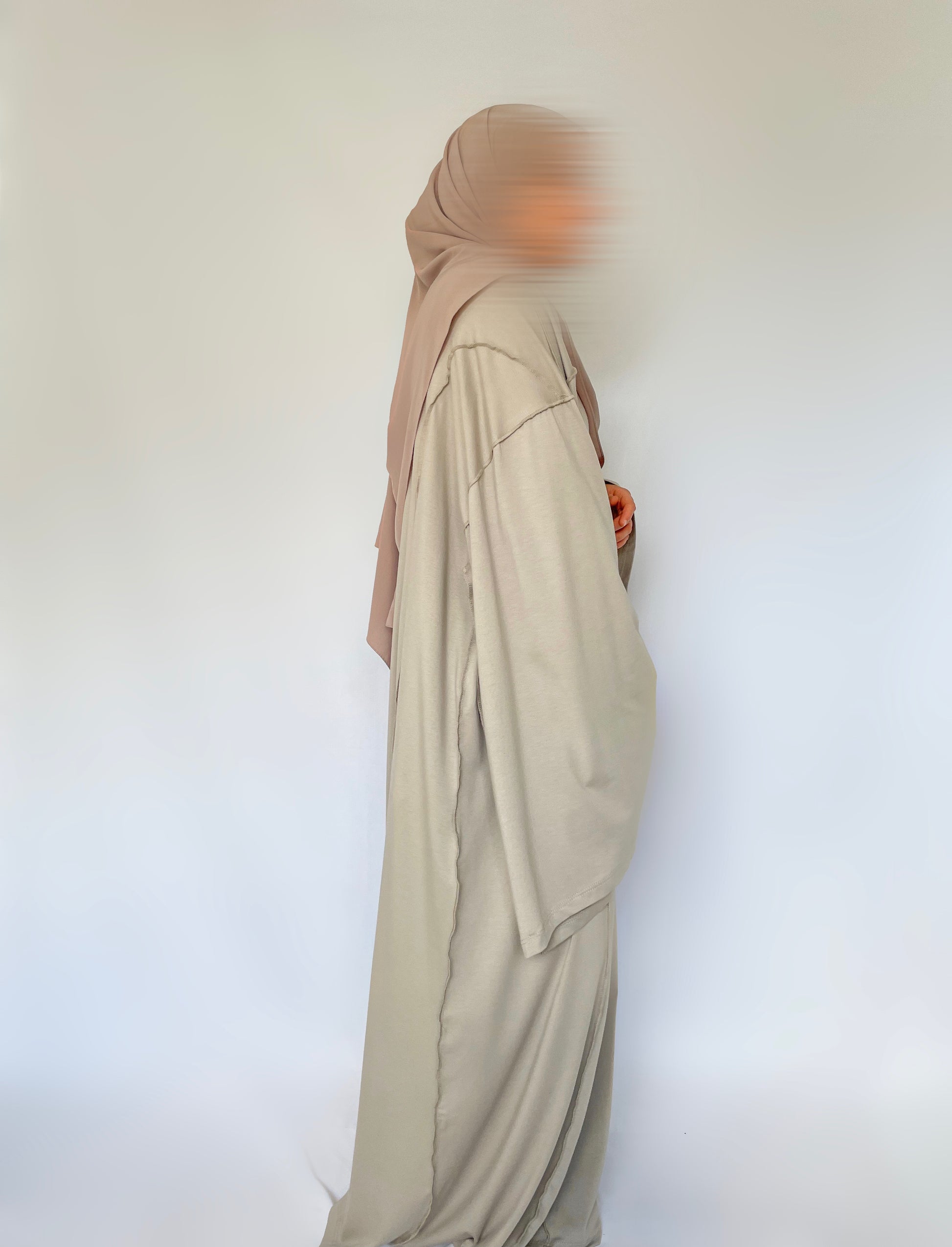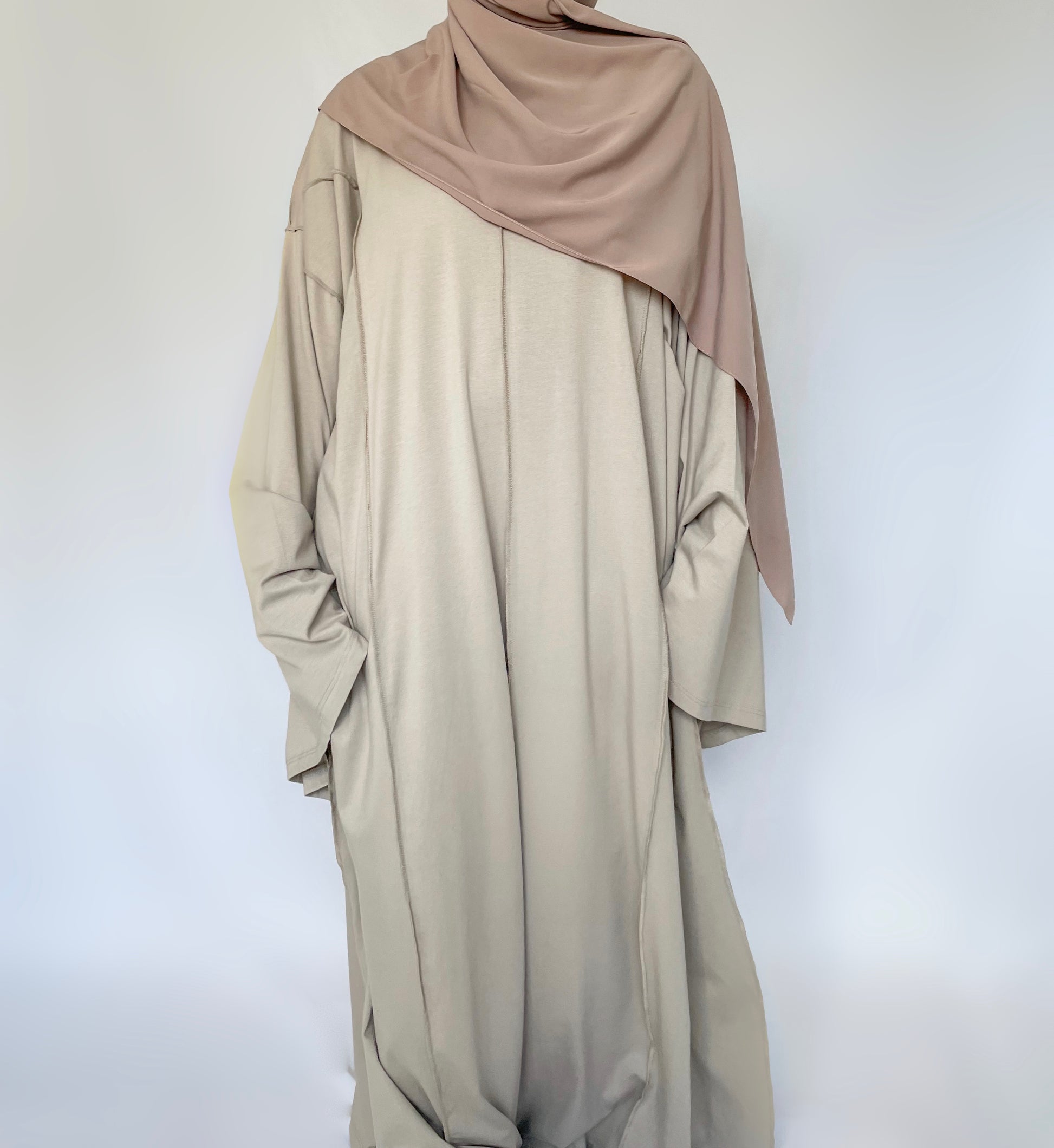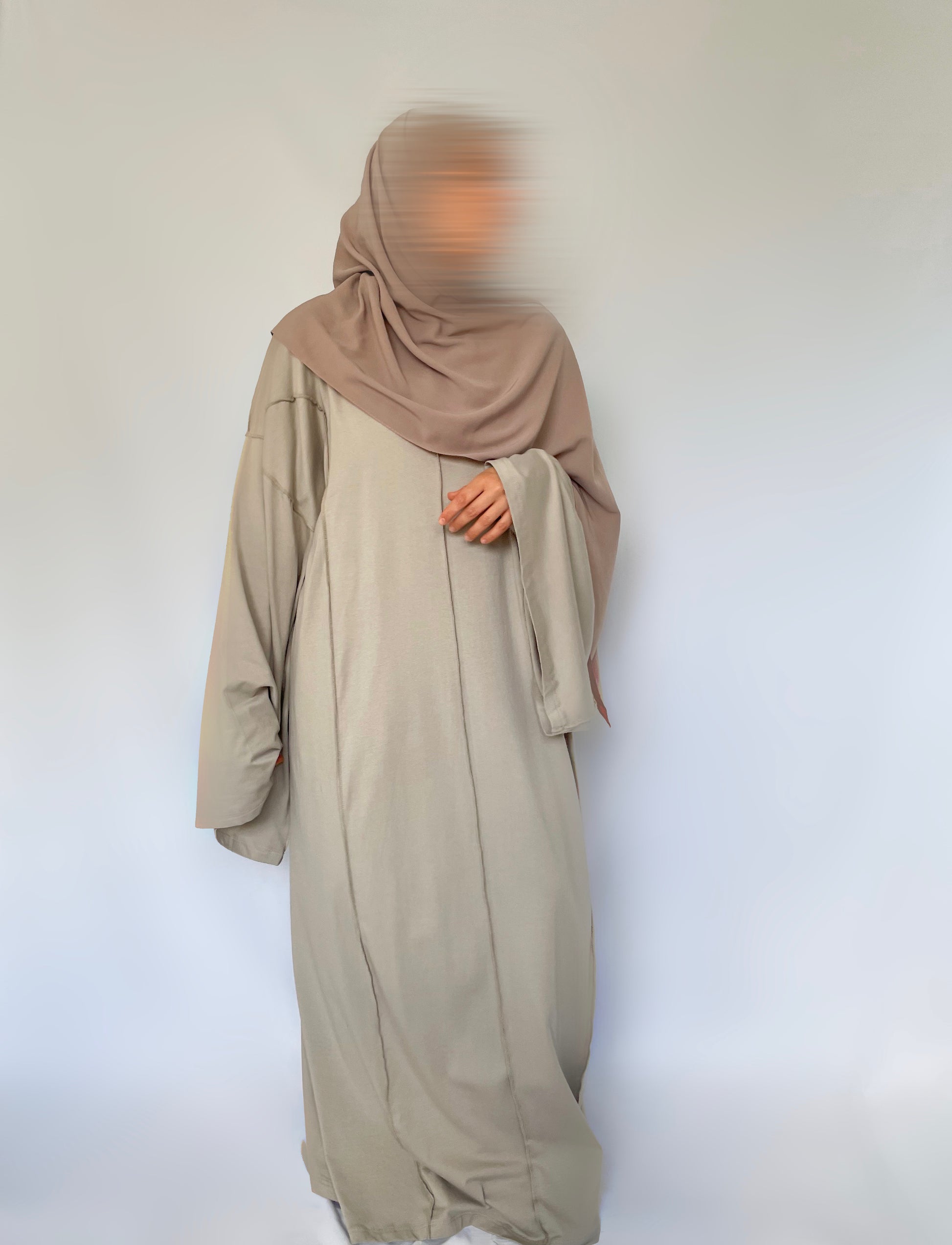 Conçue en jersey doux et fluide, cette abaya au tombé ample est soulignée de surjets apparents qui dessinent une symétrie subtile, apportant structure et modernité à une silhouette minimaliste.