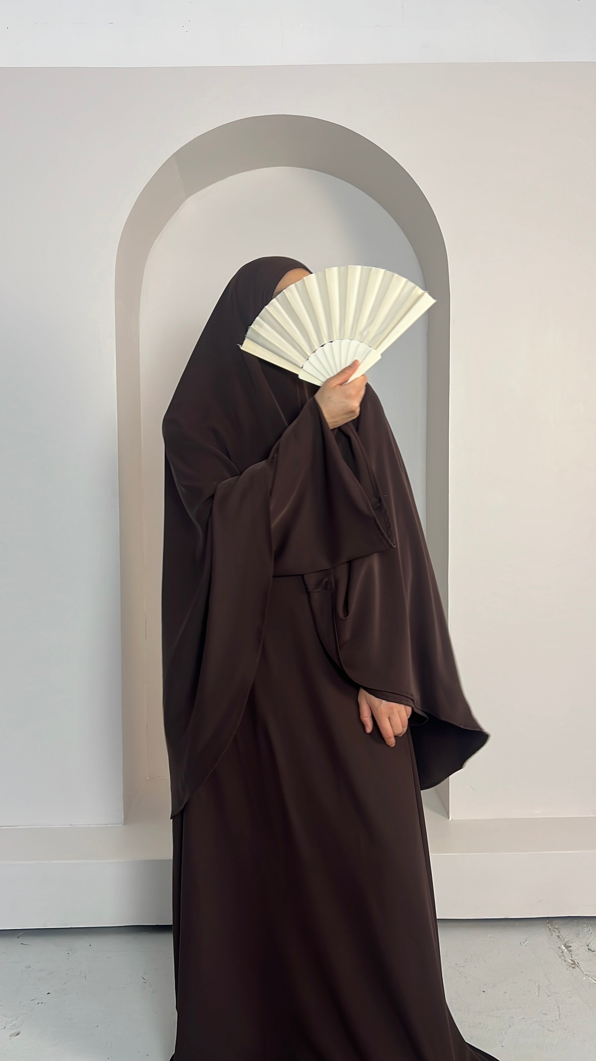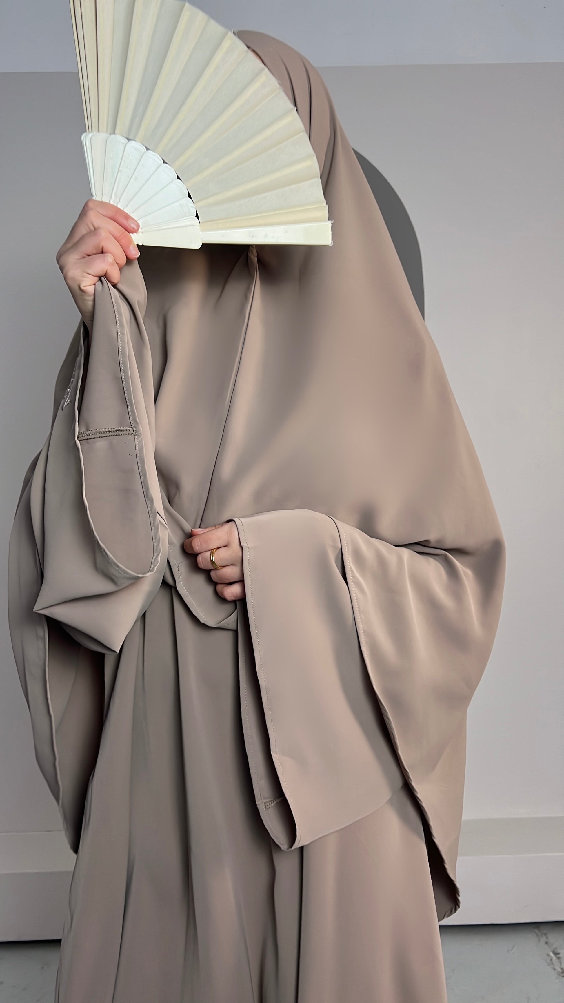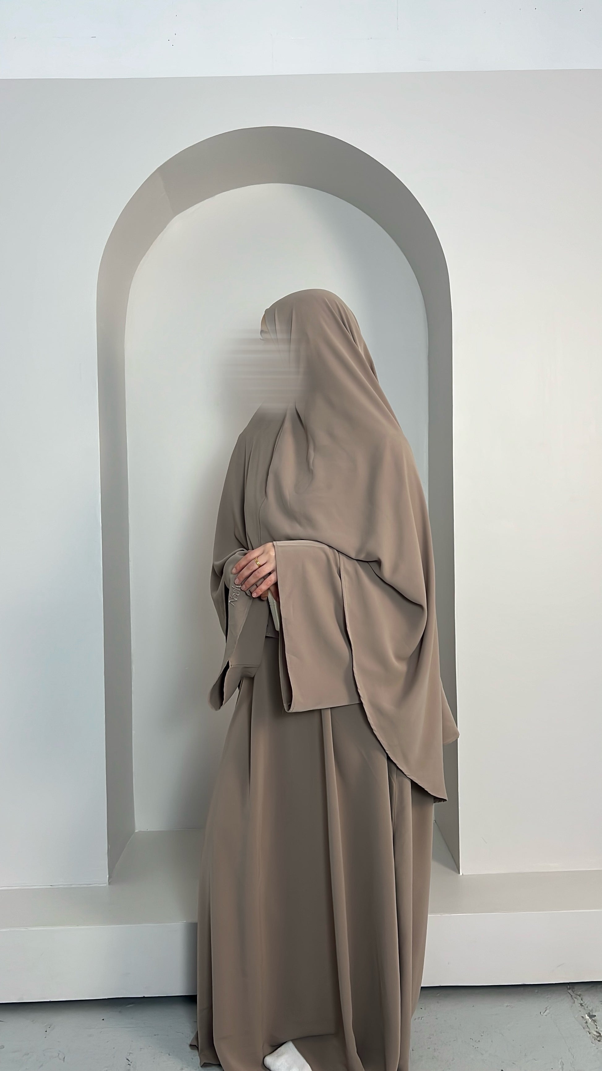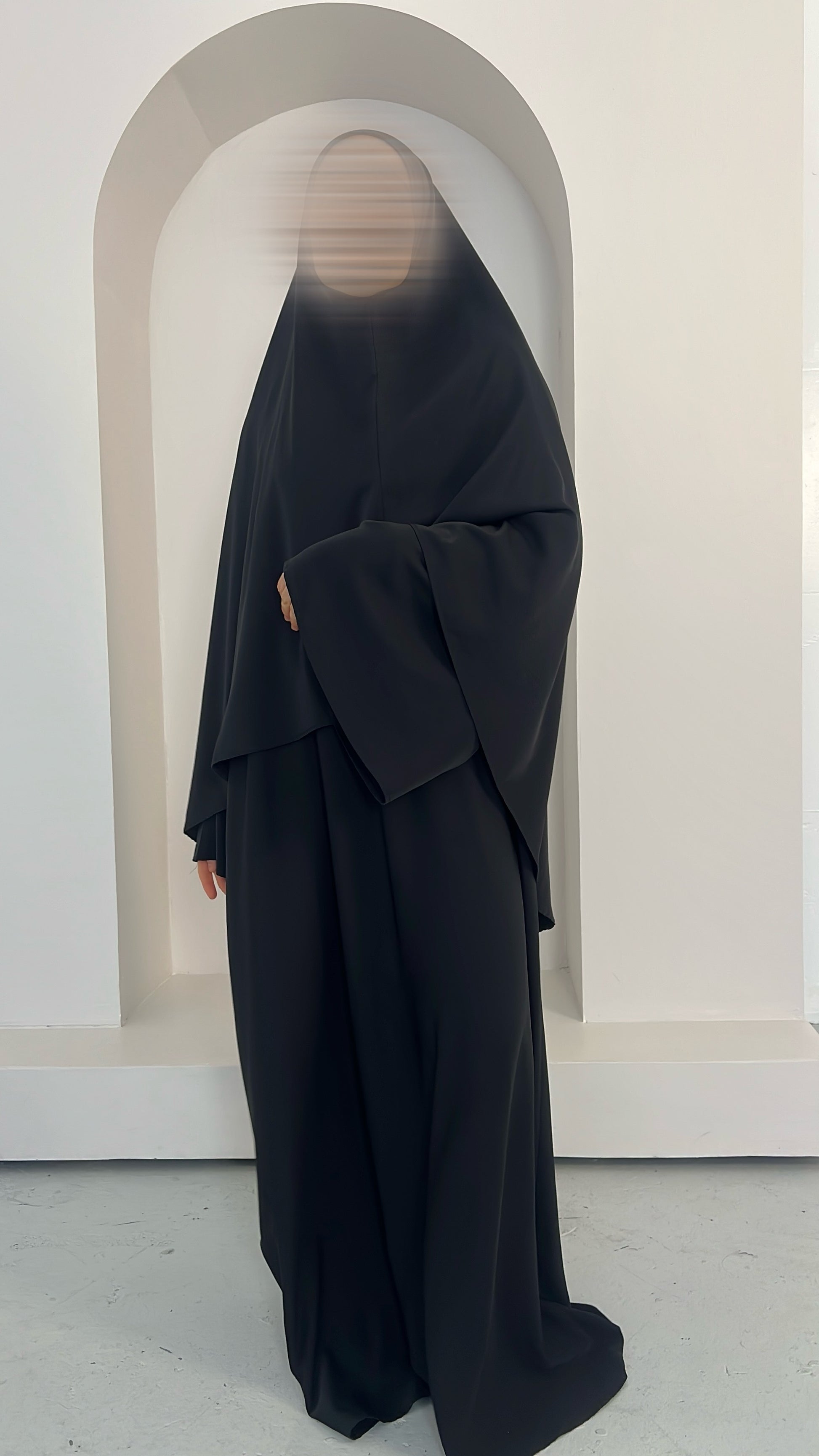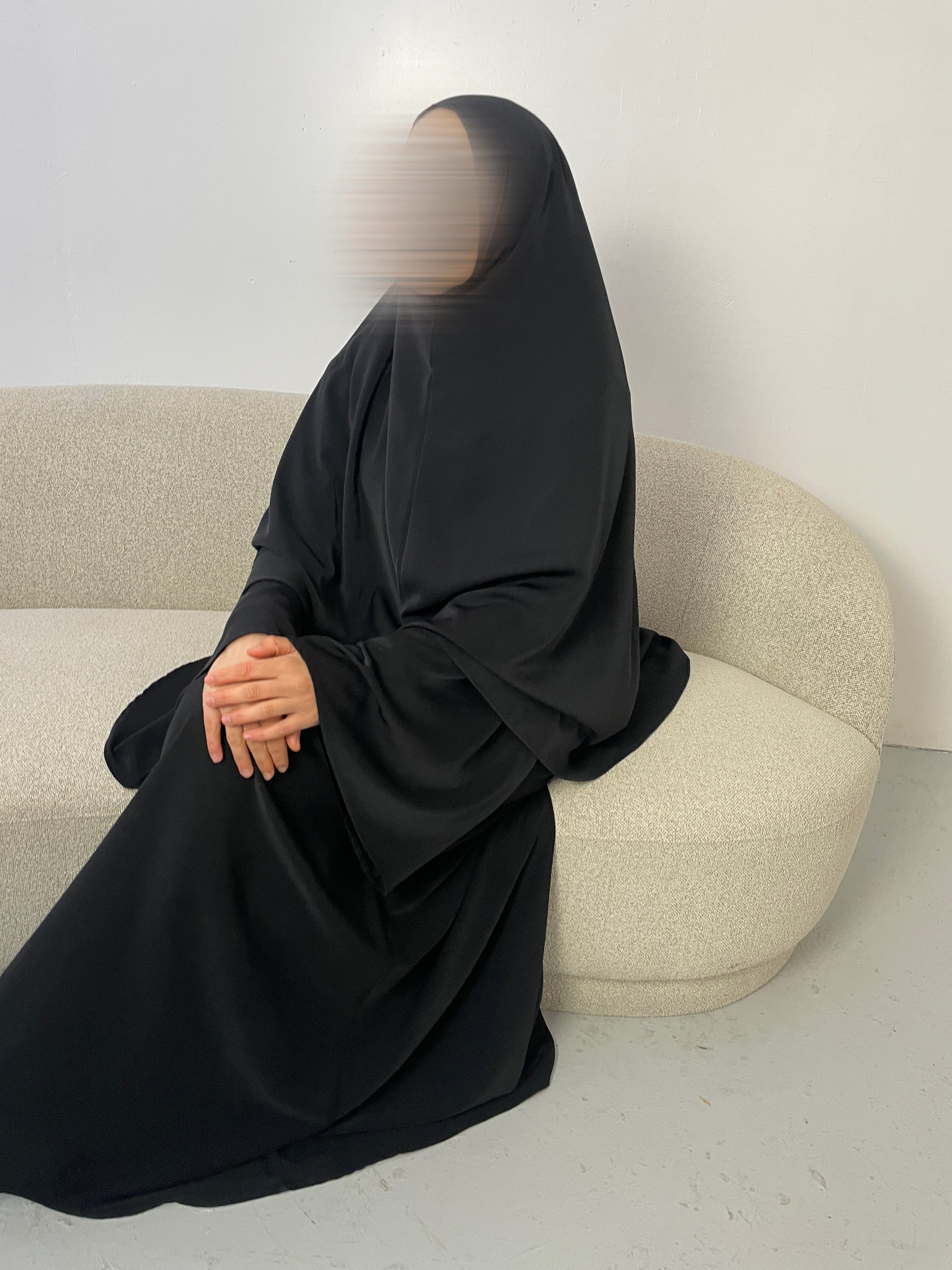 L’abaya ample, à la coupe évasée, suit le mouvement du corps sans le contraindre, tandis que le khimar rond enveloppe avec douceur, sans superflu.
