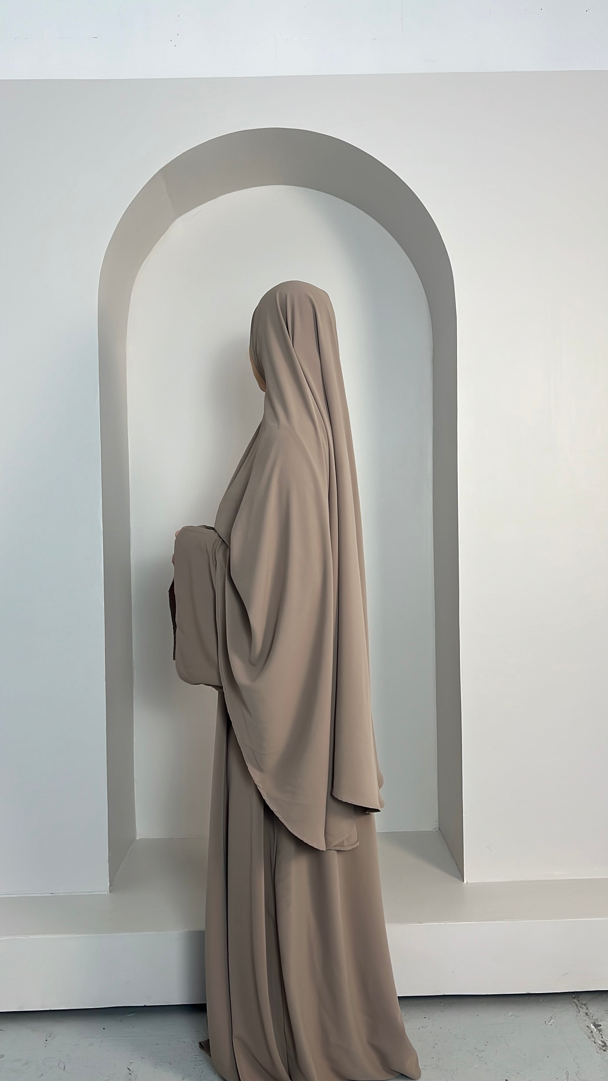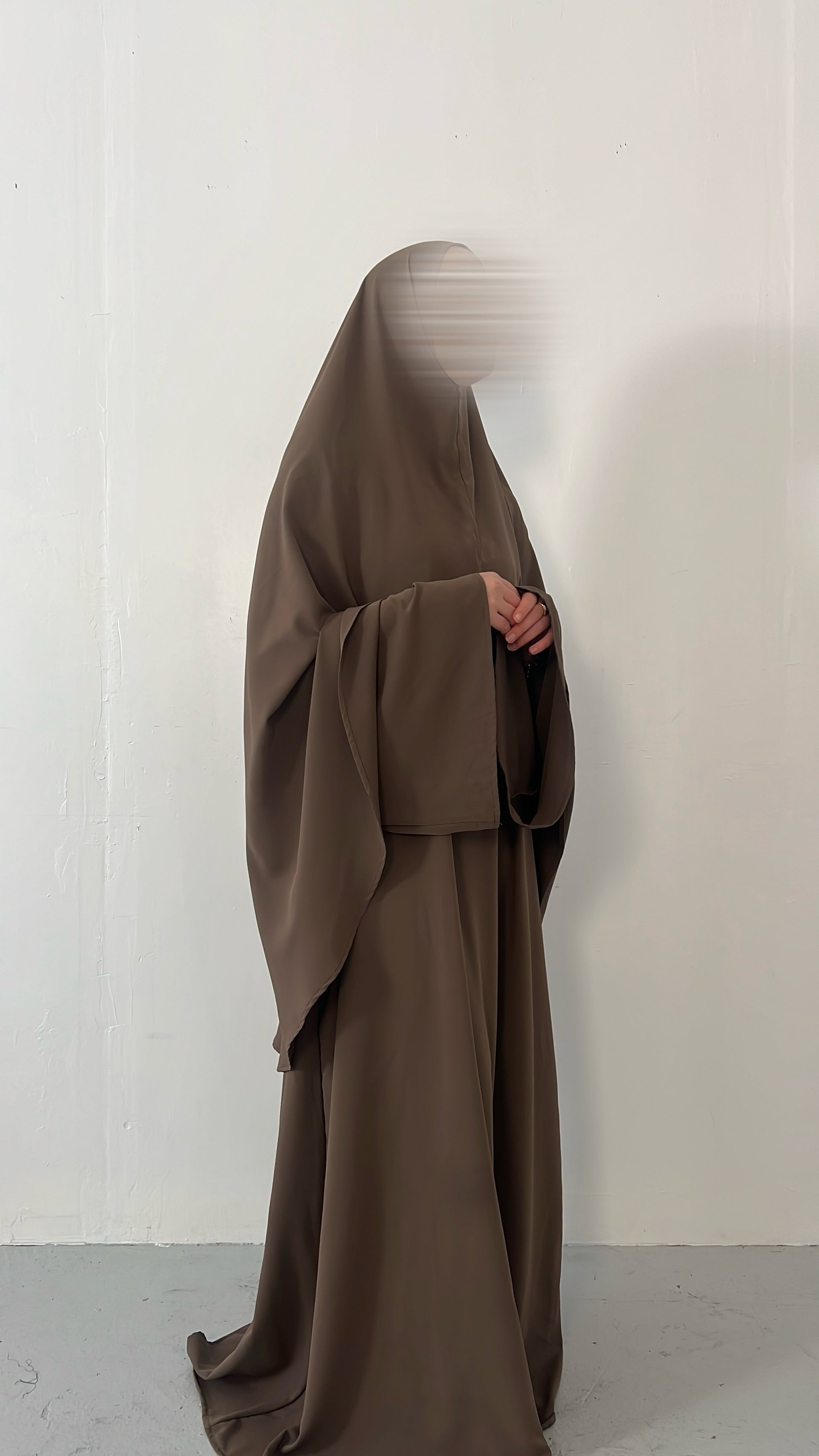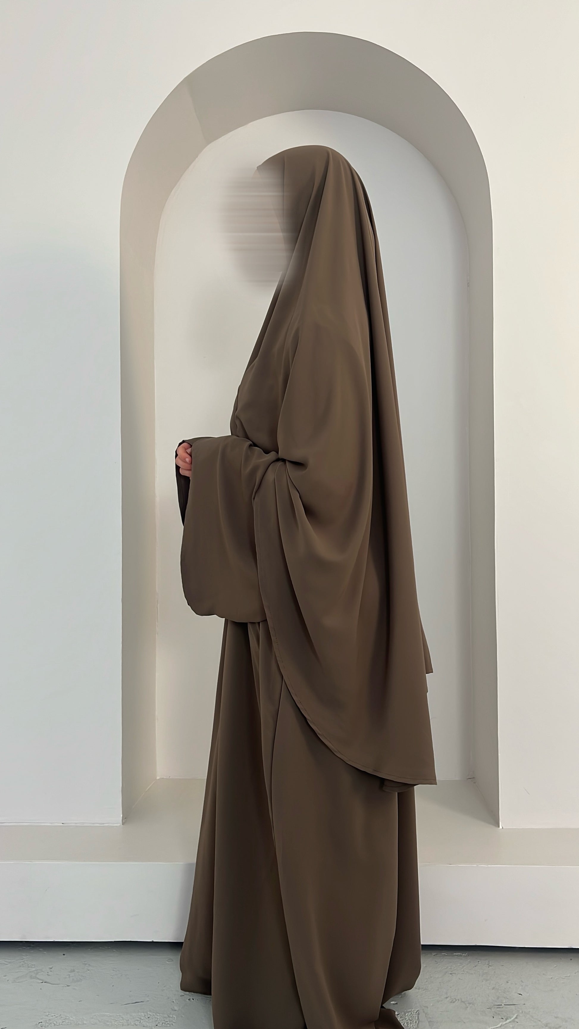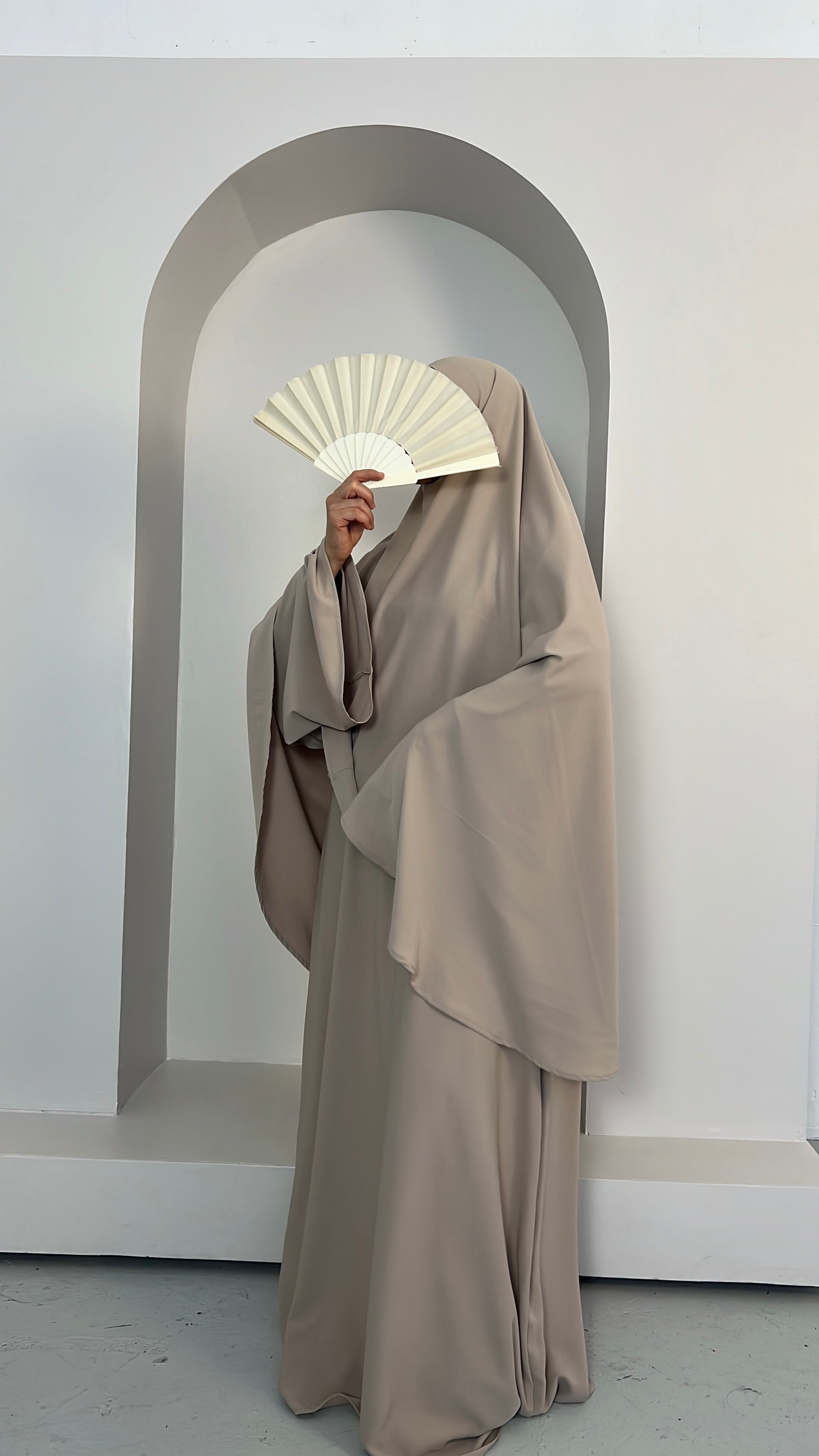 L’abaya ample, à la coupe évasée, suit le mouvement du corps sans le contraindre, tandis que le khimar rond enveloppe avec douceur, sans superflu.