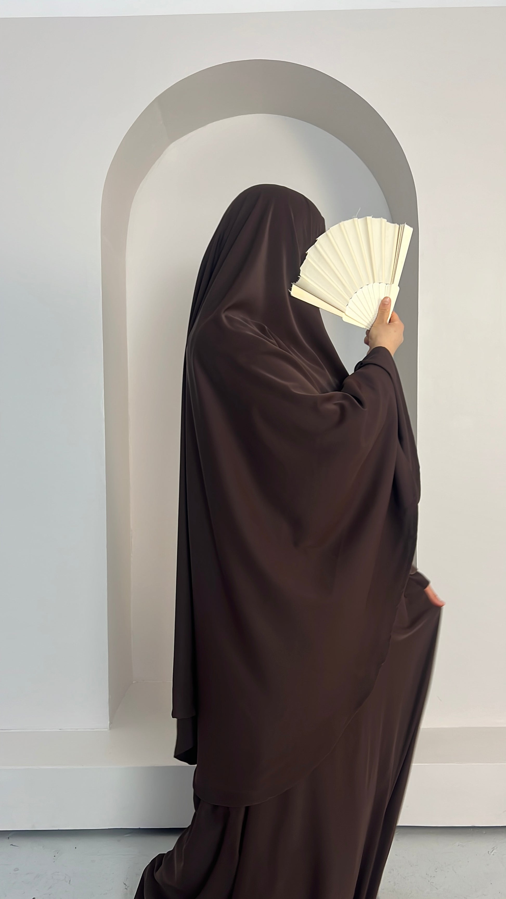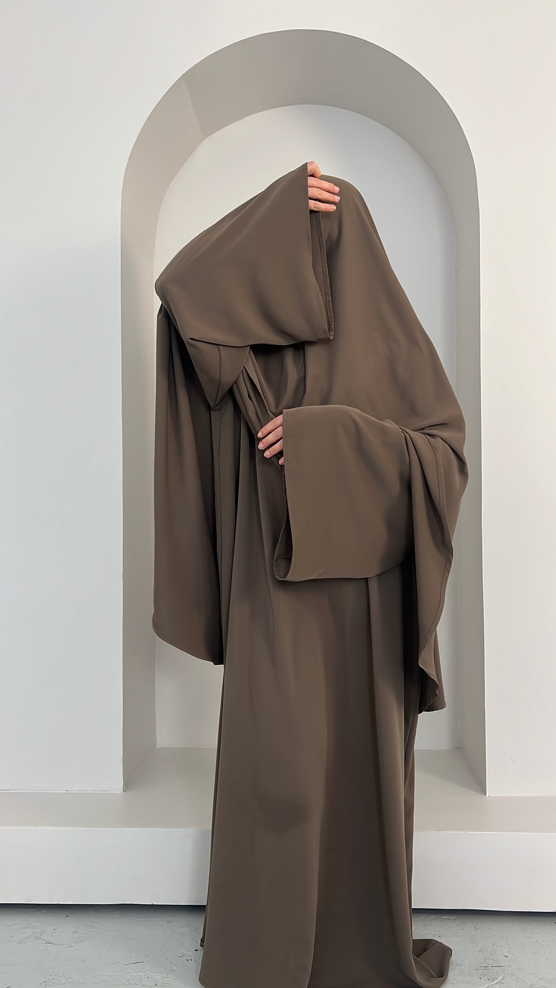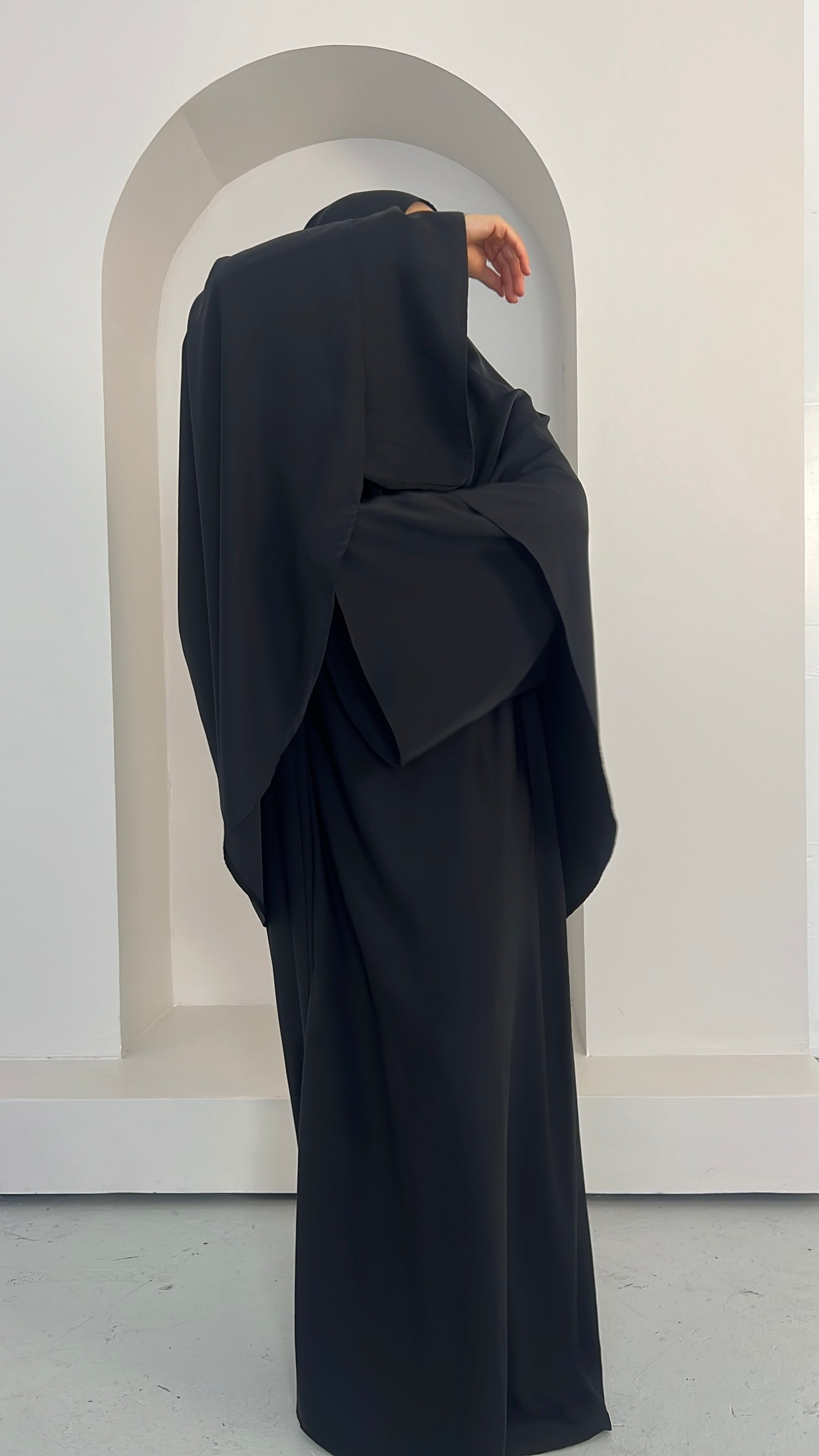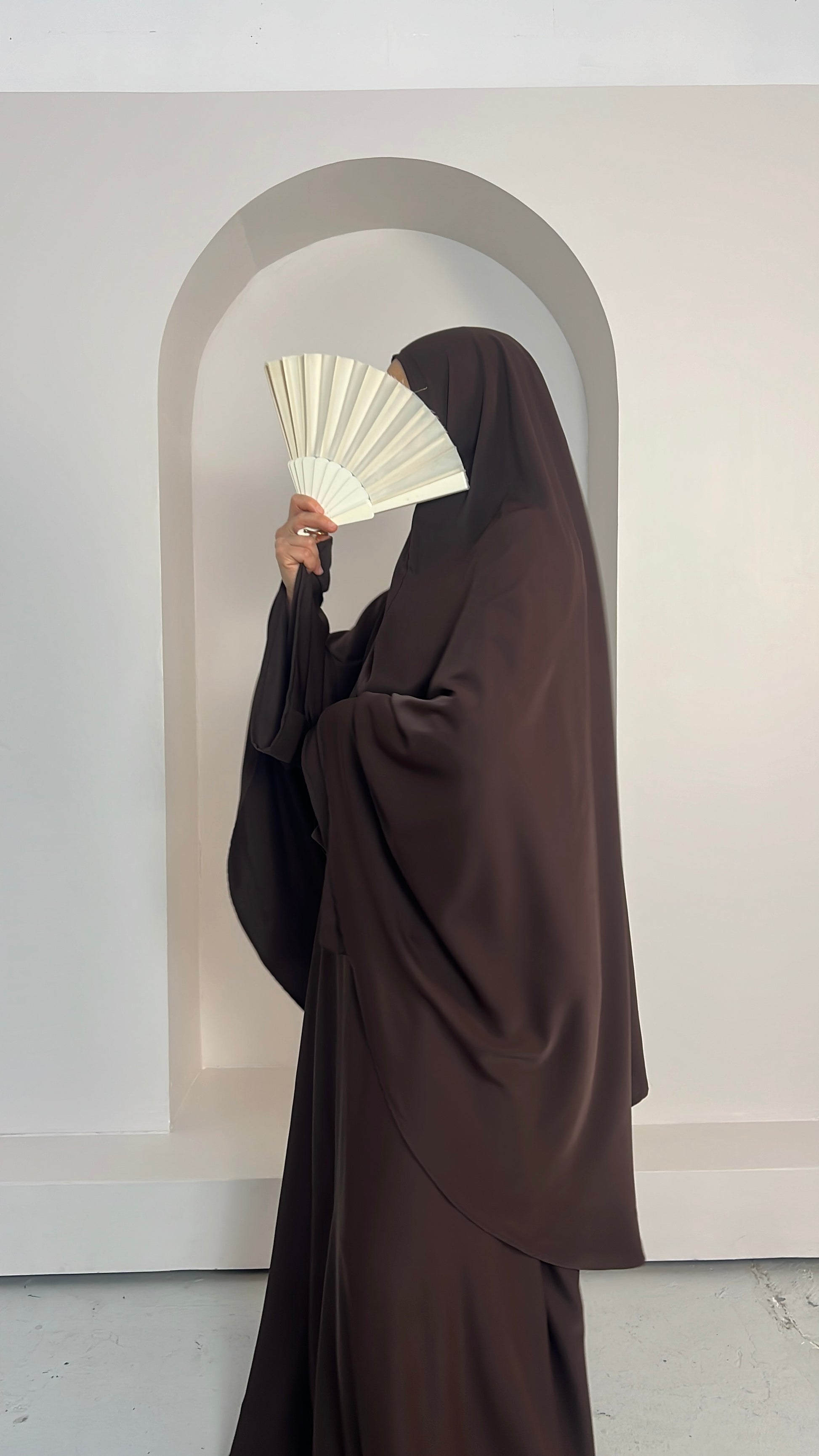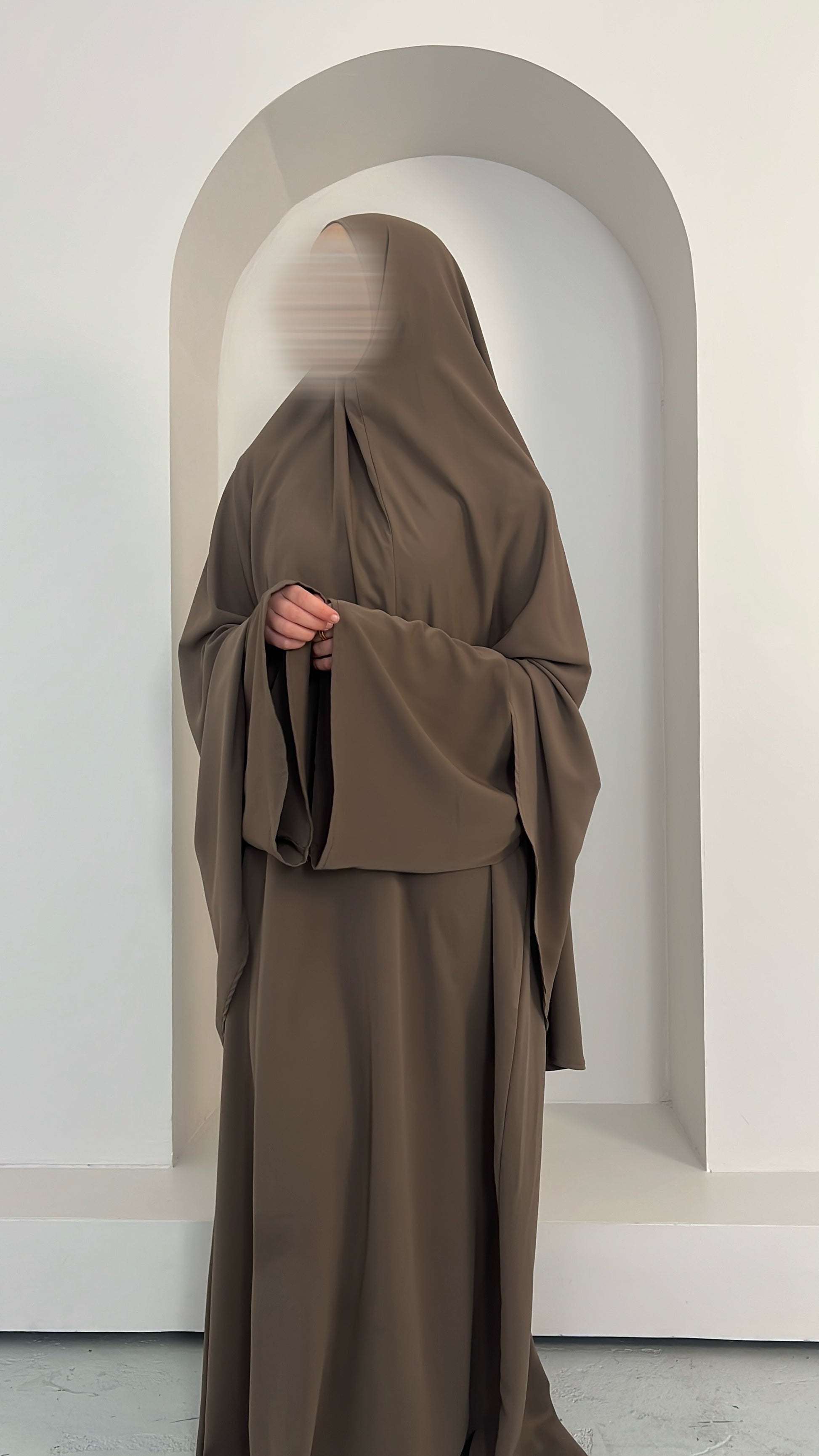 L’abaya ample, à la coupe évasée, suit le mouvement du corps sans le contraindre, tandis que le khimar rond enveloppe avec douceur, sans superflu.